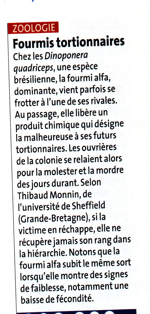 - Voir Fourmis tortionnaires. Sciences et Avenir, octobre 2002. Thibaud