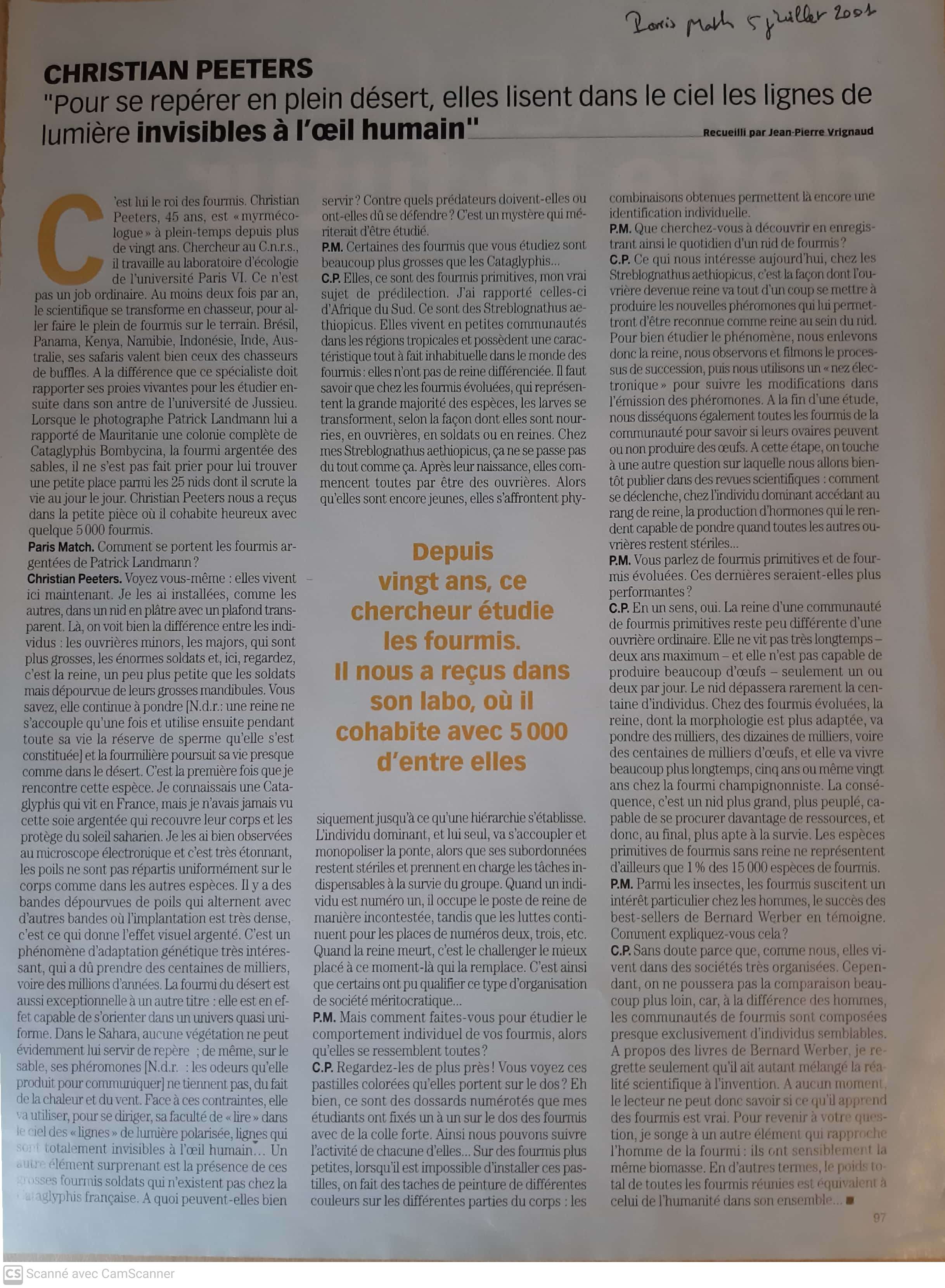C'est lui le roi des fourmis. Christian Peeters, 45 ans, est « myrmécologue » à plein-temps depuis plus de vingt ans. Chercheur au C.n.r.s., il travaille au laboratoire d'écologie de l'université Paris VI. Ce n'est pas un job ordinaire. Au moins deux fois par an, le scientifique se transforme en chasseur, pour aller faire le plein de fourmis sur le terrain. Brésil, Panama, Kenya, Namibie, Indonésie, Inde, Australie, ses safaris valent bien ceux des chasseurs de buffles. A la différence que ce spécialiste doit rapporter ses proies vivantes pour les étudier ensuite dans son antre de l'université de Jussieu. Lorsque le photographe Patrick Landmann lui a rapporté de Mauritanie une colonie complète de Cataglyphis Bombycina, la fourmi argentée des sables, il ne s'est pas fait prier pour lui trouver une petite place parmi les 25 nids dont il scrute la vie au jour le jour. Christian Peeters nous a reçus dans la petite pièce où il cohabite heureux avec quelque 5 000 fourmis.
