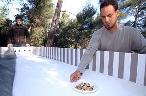 Entrainement des abeilles (Commune de Peypin, Bouches-du-Rhône, chez Serge Dini, apiculteur). Les bonbons au miel sont placés de plus en plus profondément dans le tunnel de manière à inviter aux abeilles de s'aventurer jusqu'à son extrémité. En arrière-plan, Guillaume Masson (Stagiaire INSA de Lyon), et au premier plan Julien Serres. Crédits photographiques : Philippe Psaila (2006).