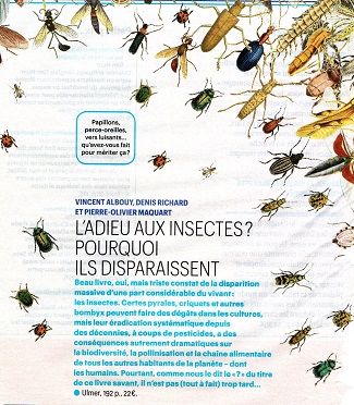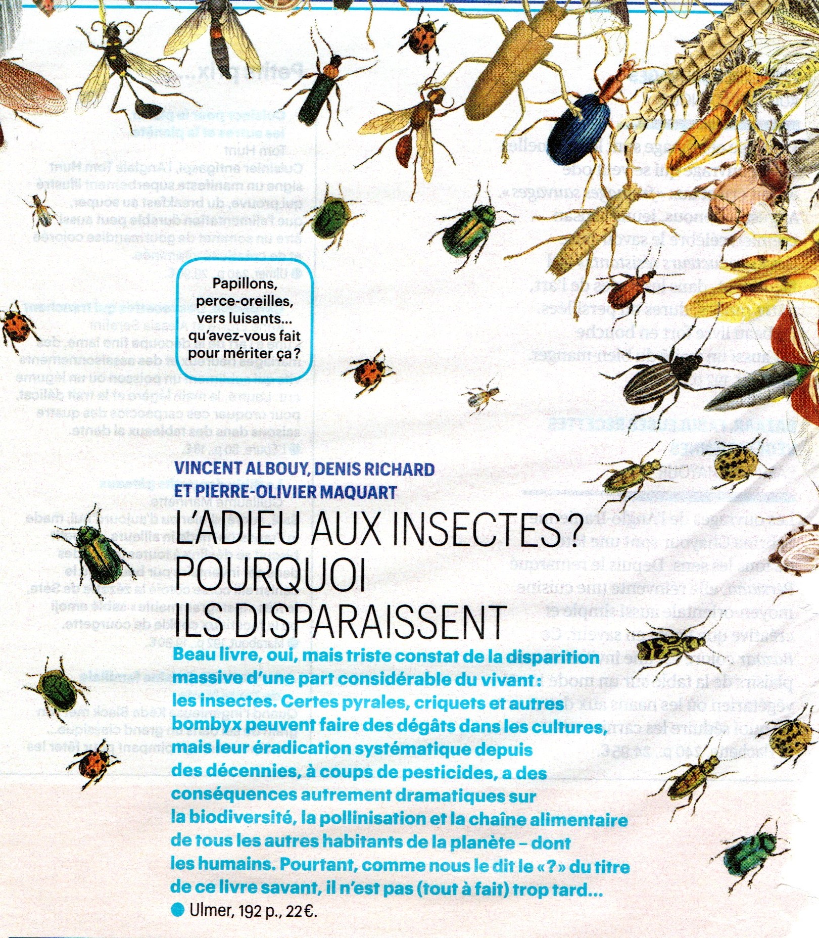 L'adieu aux insectes ? Pourquoi ils disparaissent (2020), de Vincent Albouy, Pierre-Olivier Maquart et Denis Richard, 192 pages, Ulmer éd., ISBN : 9782379221262. "80 % des insectes auraient disparu en 30 ans. C'est désormais scientifiquement avéré. Si les naturalistes s'en alarment depuis plusieurs dizaines d'années, il était difficile, jusqu'il y a peu, de trouver des éléments scientifiques chiffrés, car les études quantitatives sur les populations d'insectes communs manquaient.. Ce n'est plus le cas aujourd'hui. La première partie du livre relate les témoignages personnels des naturalistes sur cette disparition, qu'ils avaient constatée concrètement depuis des années, sans toutefois pouvoir en quantifier l'ampleur : le fameux pare-brise des voitures désormais trop propre, la disparition des vers luisants, la raréfaction des papillons, des bourdons, etc. La seconde partie est une synthèse des études scientifiques aujourd'hui disponibles sur le sujet, détaillant les différentes causes de cet effondrement (agriculture et sylviculture intensives, pesticides, pollution azotée, pollution lumineuse, réchauffement climatique...) et permettant d'envisager, en conséquence, les mesures à prendre pour enrayer ce déclin, qui n'est pas inéluctable."
