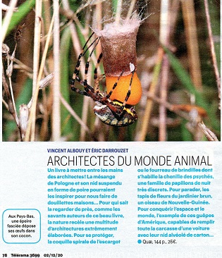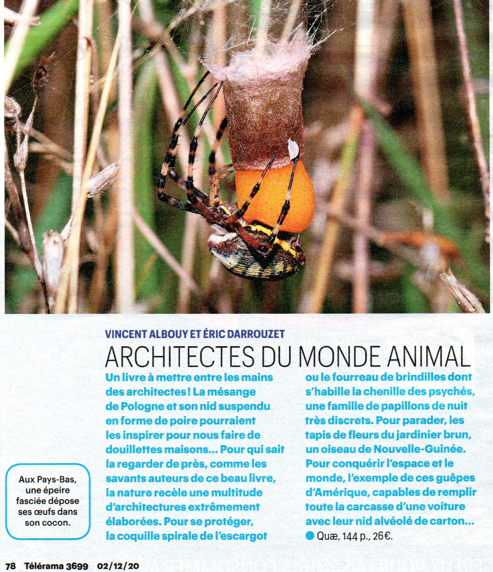 "Avez-vous jamais remarqué, sur un mur de pierre ou au dos d’un panneau le long d’une route, d’insolites fourreaux miniatures faits de débris végétaux ? C’est l’œuvre de chenilles de papillons psychés. Comme elles, d’autres animaux s’entourent individuellement d’une enveloppe protectrice, ou bien la sécrètent, exposant à la vue des curieux ces constructions souvent esthétiques. Non moins étonnants, les abris familiaux que de nombreux animaux élaborent pour protéger leur descendance. Encore plus stupéfiants, certains animaux mutualisent efforts et ressources pour concevoir des logements collectifs ! Sommaires ou sophistiqués, tous ces refuges, qui répondent aux besoins propres à l’espèce, montrent une grande diversité de forme et d’organisation architecturales : cocons, coquilles, nids, terriers, galeries, etc. Les spectaculaires photos de ce livre et les textes à la portée de tous nous emmènent à la découverte d’une ingénieuse nature. À travers une trentaine d’exemples, des vers marins aux mammifères et aux oiseaux en passant par les fourmis tisserandes, les grenouilles, et bien sûr les araignées, les auteurs nous présentent des constructions animalières aussi variées que les compétences de leurs architectes. Une belle incitation à mieux respecter la biodiversité de notre monde."Une publicité dans Télérama du 2 décembre 2020 :