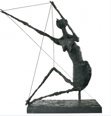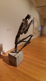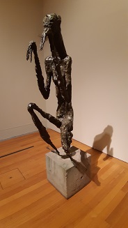 La Mante. Elle représente une femme insecte assise sur sa queue, ses deux bras repliés à hauteur de tête, terminés par deux longues mains à trois griffes, pendantes en avant. Vue au Musée d'art moderne de Belèm (Portugal, 21 décembre 2020).