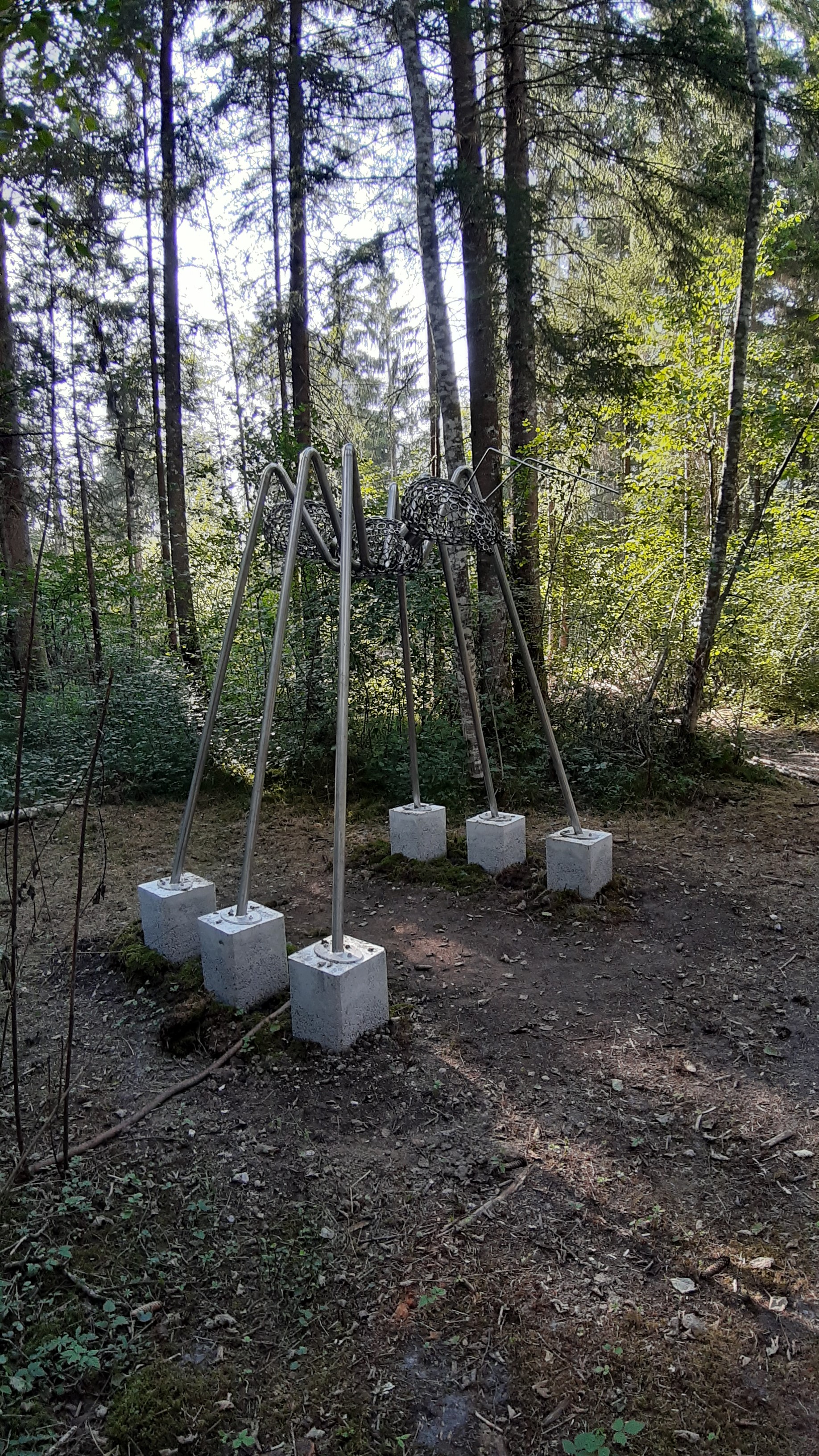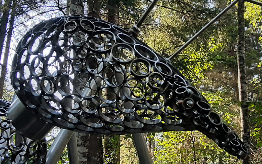 La fourmi XXL à Morillon (74) réalisée par l’artiste Septimontain (de Samoëns, 74) Thierry Pagnod, mise en place le 20 juillet 2020 le long de la rivière Le Giffre sur un sentier piéton. Voir Sculptures