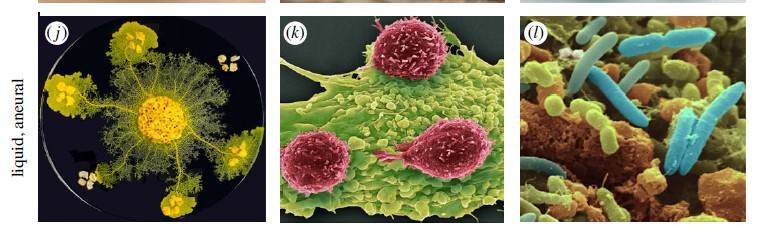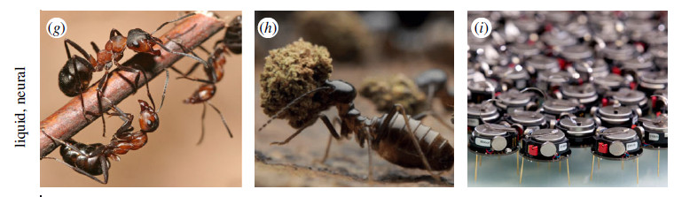 - Un article très intéressant : Cerveaux solides / liquides. Il y a deux sortes de réseaux. Les réseaux solides ont une architecture définie et persistante. Les réseaux liquides sont composés d'agents qui échangent, stockent et traitent des informations en l'absence de connections permanentes, et se déplacent dans l'espace. On les qualifie de "cerveaux liquides". Cela inclue les fourmis (g), les termites (h), les systèmes immunitaires (k), quelques microbiomes (l) et les Physarum (blob - j). On peut imiter les sociétés de fourmis avec des robots qui interagissent (i). Dans ce type de système social chaque élément a son propre cerveau "solide" (fourmis - termites). Dans les autres il n'y a pas de cerveau individuel et pourtant ils arrivent à résoudre des problèmes complexes, sont capables d'apprentissage et de mémoire, et prennent des décisions en réponse à l'environnement. En plus le système immunitaire et le microbiome interagissent.