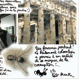 - Un dessin de Plantu (LM Magazine 27 février 2010) : des fourmis sur le mur du parlement colombien