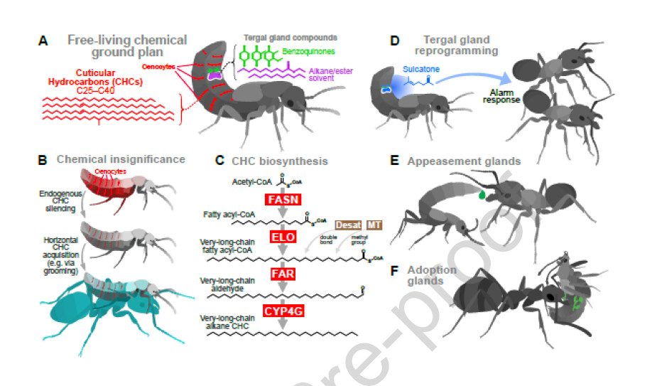 La chimie qui permet la myrmécophilie : glandes tergales, l'insignifiance chimique (très peu d'hydrocarbures), le mimétisme chimique, les glandes d'apaisement.