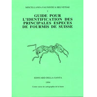Guide pour l'identification des principales espèces de fourmis de Suisse (CSCF Neuchâtel 1994). "Ce guide est consacré à la faune myrmécologique de Suisse. Les espèces les plus importantes, une soixantaine, sont décrites et illustrées par les dessins originaux de l'auteur. Les clés de détermination et les traits caractéristiques des espèces sont en français et allemand. Une liste des espèces en danger et un lexique trilingue complètent cette publication."