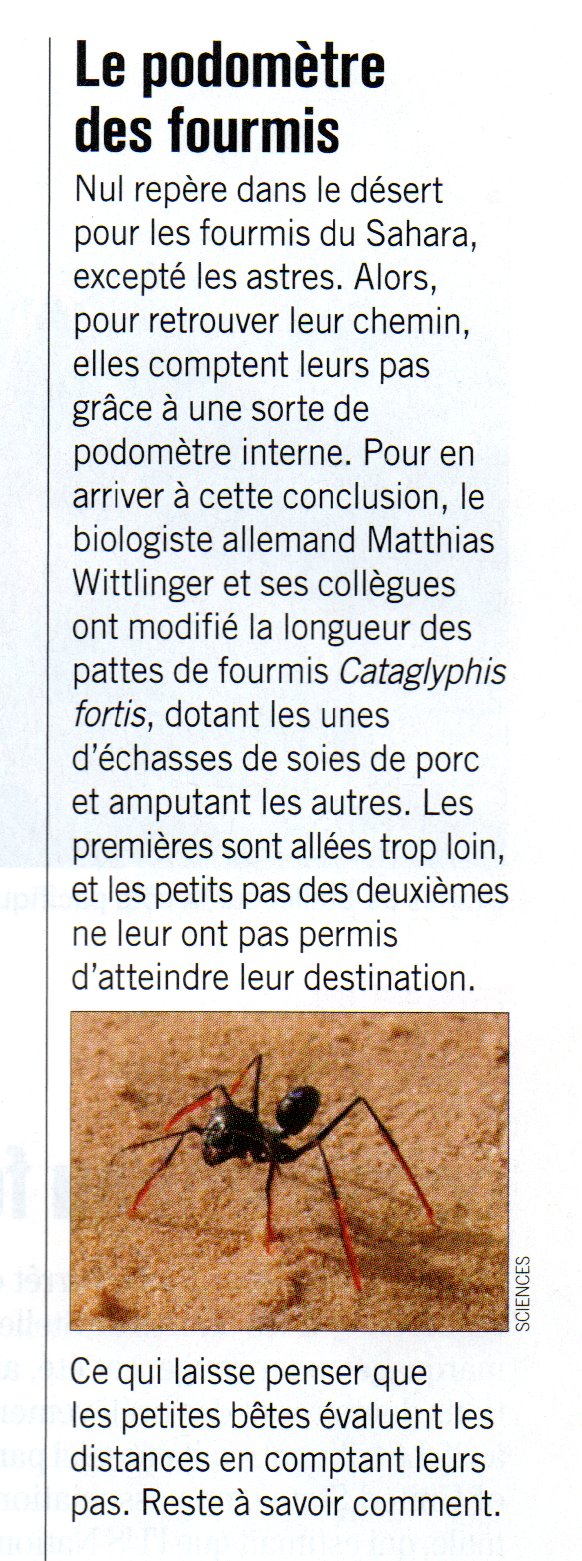 Le podomètre des fourmis, Sciences et Avenir, août 2006, p.33. Wittliinger (et al 2007) ont ajouté des échasses aux Cataglyphis du désert pour mesurer leurs déplacements.