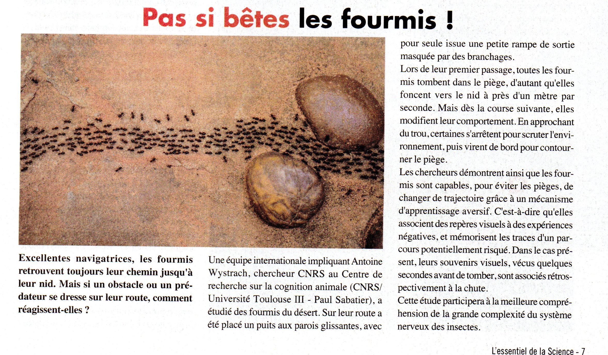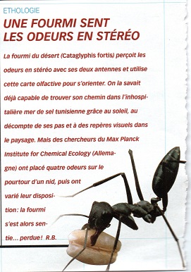 - Une fourmi sent les odeurs en stéréo, Sc & Vie, mai 2010, Cataglyphis fortis :