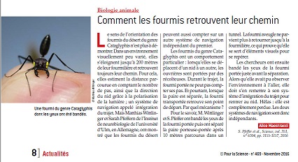 Comment les fourmis Cataglyphis retrouvent leur chemin. Pour la Science, nov 2016 :