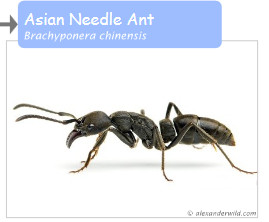 Pachycondyla (Brachyponera) chinensis (Asian needle ant, fourmi aiguille asiatique, de Japon, Chine et Corée) a colonisé la Nouvelle-Zélande puis les USA dans les années 1930. C'est une fourmi à la piqûre très douloureuse, d'où son nom, et provoque des réactions allergiques à cause de ses allègènes protéiques. Elle devient invasive dans les états du sud depuis les années 2000 où elle fait reculer la fourmi d'Argentine. C'est une fourmi qui se nourrit de termites Reticulitermes flavipes. Pour lutter contre cette fourmi on teste de leur donner des termites empoisonnés avec du fipronil. Ce serait plus efficace que des appâts avec "moins" de pollution environnementale... bof .. (Buczkowski 2016).