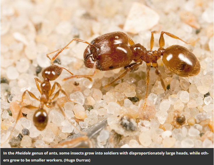 Voir les travaux sur les soldates de Pheidole selon Loïc Bollache (La guerre chez les fourmis, p.151, Pdf).