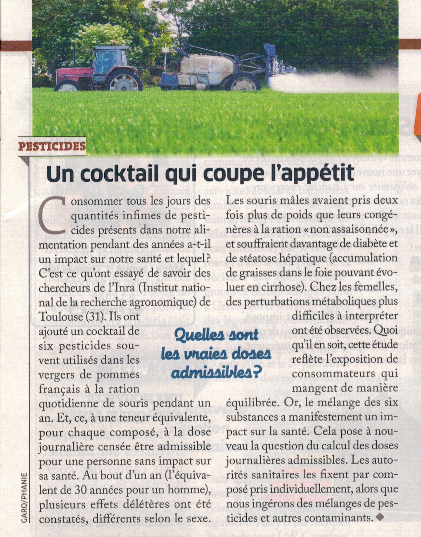 Problème : l'effet cocktail n'est toujours pas pris en compte par les autorités sanitaires .. Le gouvernement vient d'adopter le 18 janvier 2018 un plan pour réduire l'utilisation des pesticides dans l'agriculture. Le problème de l'effet cocktail est enfin envisagé (Foucart 2018).