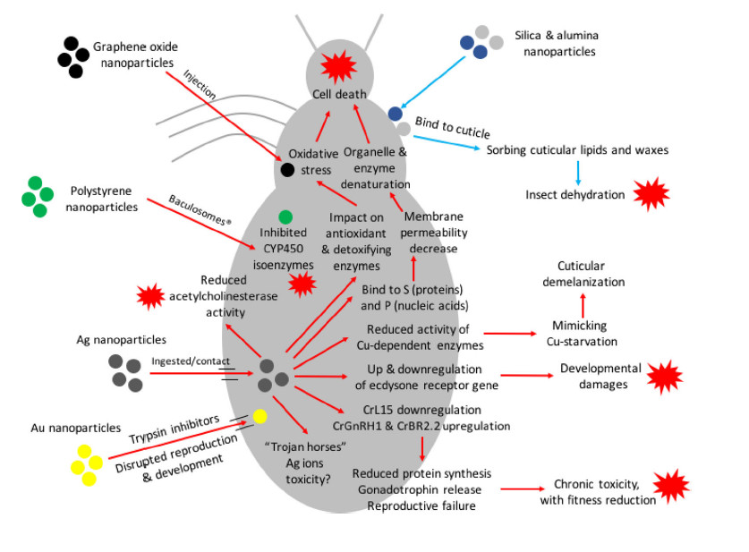 Les nanoparticules intéressent de plus en plus les producteurs de pesticides, en particulier pour la lutte contre les moustiques et les tiques. On a déjà relevé des effets des nanoparticles d'argent, d'oxyde de graphène sur les antioxydants et les enzymes détoxyfiantes entraînant un stress oxydatif et la mort cellulaire. Les nanoparticles d'argent réduisent l'activité de l'acétylcholinestérase, dérégulent les gènes pour la synthèse de la gondotrophine. SiO2 et Al203 se fixent sur la cuticule et provoquent une déshydratation (Benelli 2018 - voir un schéma du mode d'action des nanoparticules, c'est impressionnant).