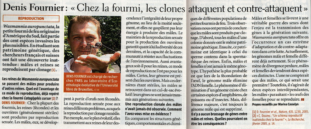 - Denis Fournier : "Chez la fourmi, les clones attaquent et contre-attaquent". La Recherche, septembre 2005. Pdf