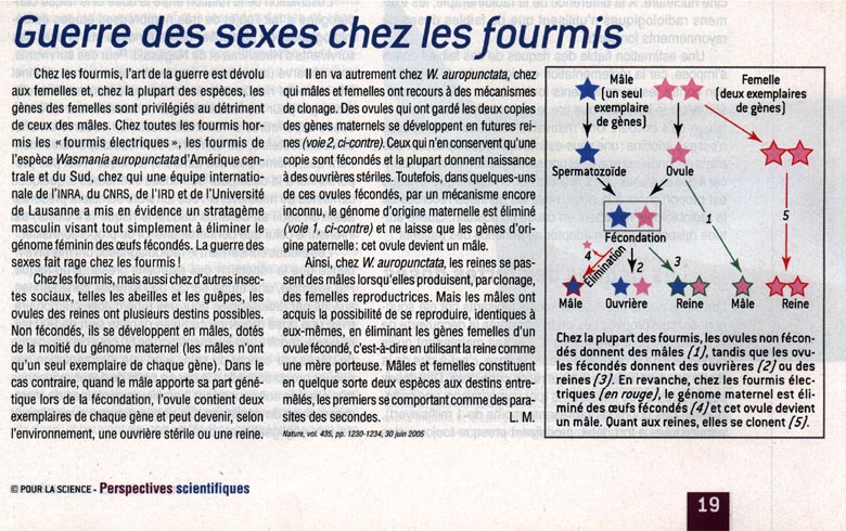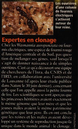 - Guerre des sexes chez une fourmi : reproduction clonale des mâles et des reines. Communiqué Presse INRA 30 juin 2005. Pdf