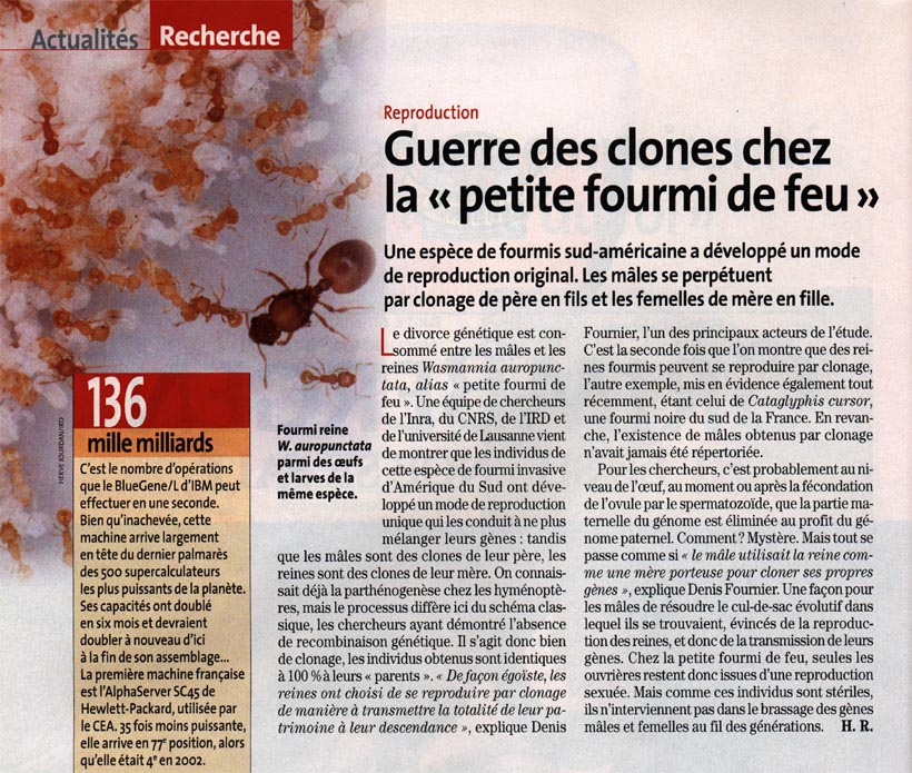 - L'étrange vie si peu sexuelle de la "petite fourmi de feu". Stéphane Foucart, Le Monde2juillet 2005. Pdf